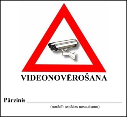 Par novērošanu, izņemot šo noteikumu 8.1 punktā minētajā vietā, brīdina ar informatīvo zīmi (1. pielikums), kuru veido novērošanas videokameras attēls 35 grādu leņķī uz balta fona, ko apņem sarkana robežlīnija vienādmalu trīsstūra formā. Trīsstūra vienas malas garums ir 145 mm, malas platums – 12 mm. Zem trīsstūra atrodas uzraksts ar melniem burtiem "VIDEONOVĒROŠANA". Zem tā norāda videonovērošanas mērķi, pārziņa nosaukumu, adresi un kontakttālruni. Informatīvās zīmes izmēru var proporcionāli palielināt vai samazināt.