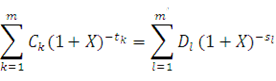 1. Pamatvienādojums, ar ko nosaka gada procentu likmi un izsaka ekvivalenci gada periodā starp esošo aizdevumu, no vienas puses, un kopējo esošo atmaksas un izmaksu vērtību, no otras puses, ir šāds: