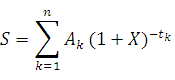 tk – gados un gada daļās izteikts starplaiks starp pirmo kredīta izmaksas datumu un katras nākamās kredīta daļas izmaksas datumu, tātad t1=0;