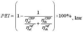 ηelref – lietderības koeficients atsevišķai elektroenerģijas ražošanai atkarībā no izmantotā kurināmā veida (ja koģenerācijas stacijā izmanto koksnes kurināmo vai biogāzi, pieņem ηelref = ηelharm), ko aprēķina, izmantojot šādu formulu: