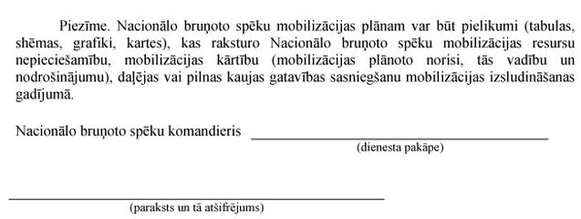 Tautsaimniecības mobilizācijas plānu un Nacionālo bruņoto spēku mobilizācijas plānu apstiprina Nacionālās drošības likumā un Nacionālo bruņoto spēku likumā noteiktajā kārtībā.