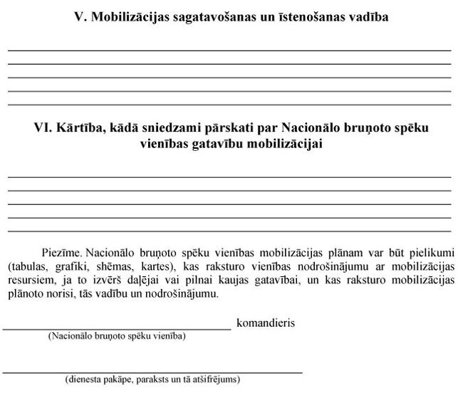 Nacionālo bruņoto spēku veidu un vienību mobilizācijas plānus apstiprina un precizē attiecīgā Nacionālo bruņoto spēku veida vai vienības komandieris.