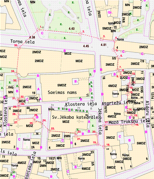 no 17. atzīmes uz 18. atzīmi riņķa līnijas loks ar rādiusu 25 m, centrs koordinātās x – 314084,813 y – 507032,224 |