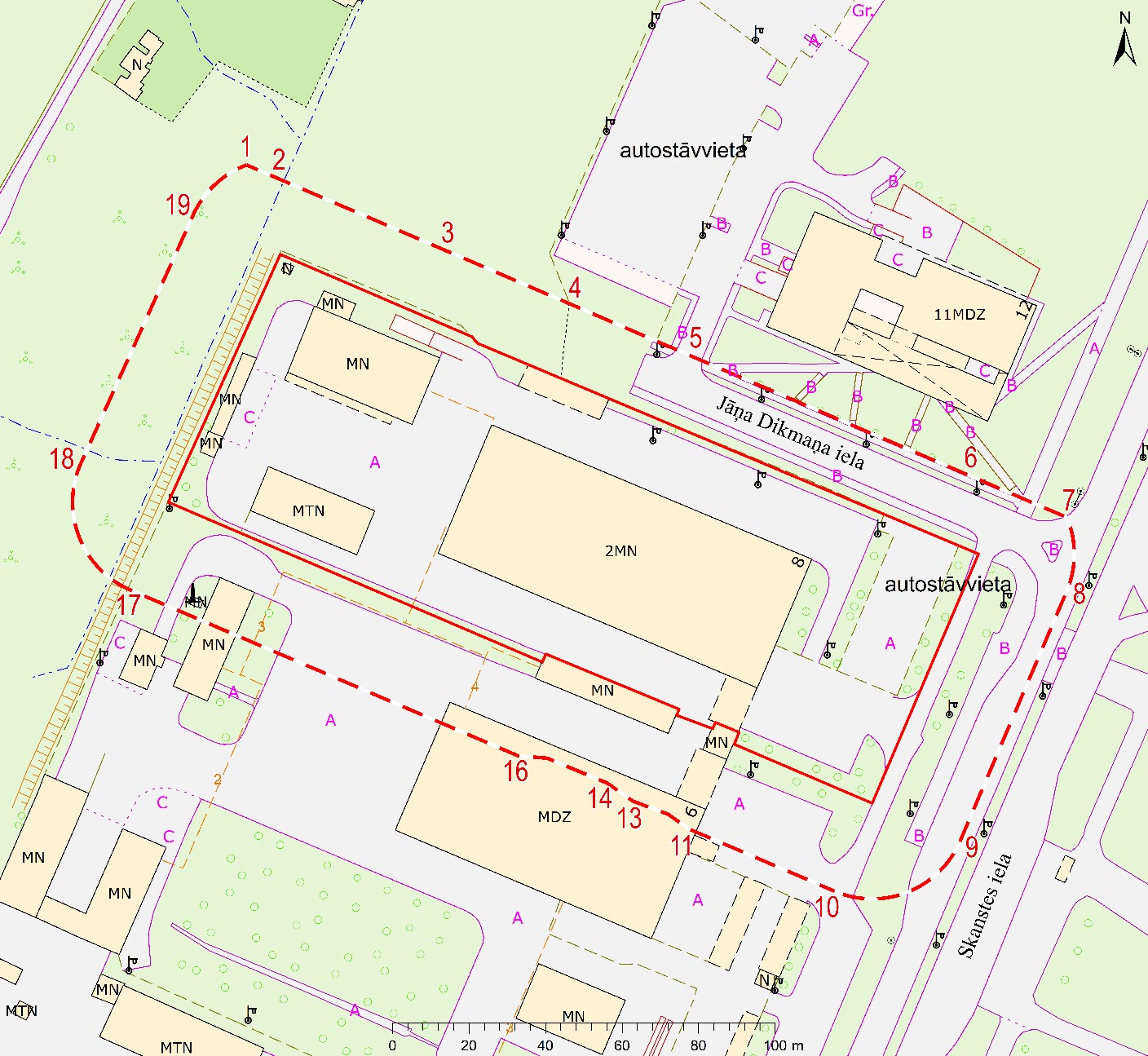 no 19. atzīmes uz 20. atzīmi ziemeļu virzienā |