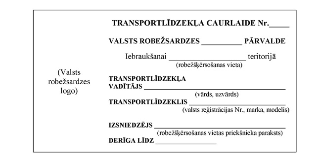 | Nr. | Caurlaides Nr. | Persona, kurai izsniegta caurlaide, – vārds, uzvārds, personas kods | Transportlīdzekļa valsts numurs | Izsniegšanas datums | Amatpersona, kas izsniegusi caurlaidi, – uzvārds un paraksts | Personas paraksts par caurlaides saņemšanu | Datums, kad caurlaide anulēta | Piezīmes |