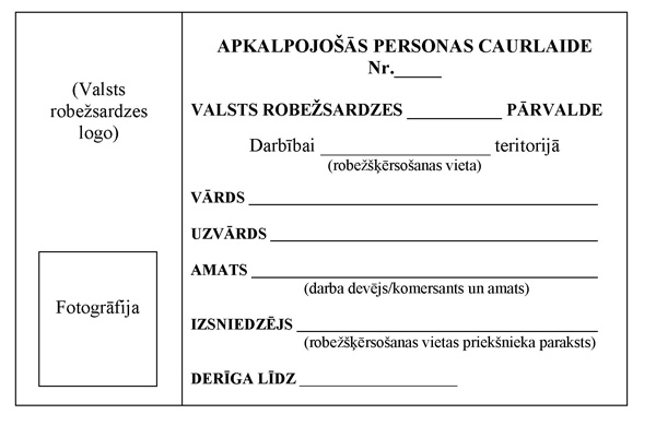 | Nr. | Caurlaides Nr. | Persona, kurai izsniegta caurlaide, – vārds, uzvārds, personas kods | Izsniegšanas datums | Amatpersona, kas izsniegusi caurlaidi, – uzvārds un paraksts | Personas paraksts par caurlaides saņemšanu | Datums, kad caurlaide anulēta | Piezīmes |