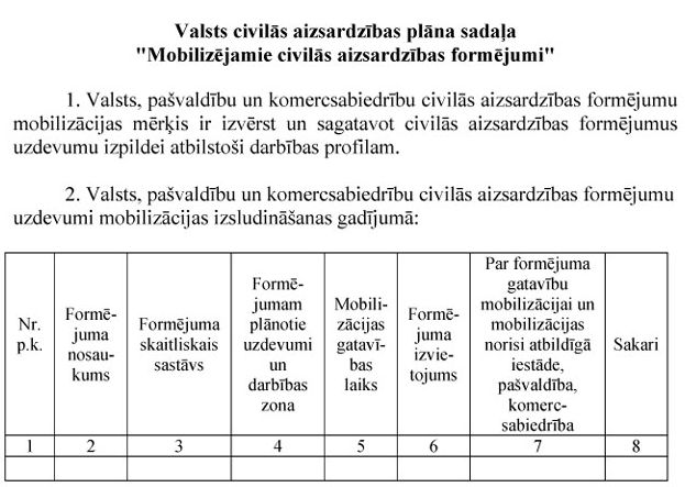 Valsts civilās aizsardzības plāna sadaļu “Mobilizējamie civilās aizsardzības formējumi” un mobilizējamo civilās aizsardzības formējumu mobilizācijas plānus.
