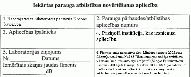 Iekārtas, kuras ražotas Eiropas Savienības dalībvalstīs un kuru atbilstība novērtēta Eiropas Savienībā noteiktajā kārtībā, var brīvi piedāvāt Latvijas tirgū, ja ražotājs vai tā pilnvarotais pārstāvis Eiropas Savienībā ir sastādījis iekārtas atbilstības deklarāciju un iekārta ir marķēta ar CE marķējumu un norādi par garantēto skaņas jaudas līmeni.