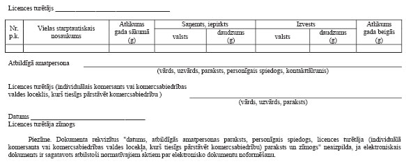 pārskatu par iepriekšējo kalendāra gadu (turpmāk – pārskata gads) (iesniedz līdz 15.februārim). Pārskatā norāda informāciju saskaņā ar šo noteikumu 6.pielikumu un sniedz kopsavilkumu par pārskata gadā saražoto, ievesto, izvesto zāļu apjomu salīdzinājumā ar attiecīgo zāļu apjomu iepriekšējā gadā, kā arī vērtējumu par pieauguma vai samazinājuma iemesliem.